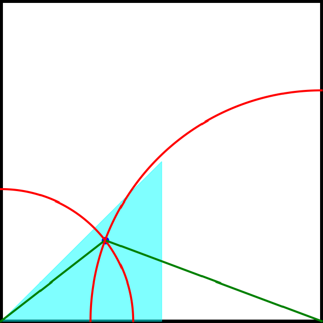 We have found an alternative way to represent the original problem as the probability of the red point being in the highlighted red area. From now on we will define the total area of the square to be 1, so if the red area is 0.63 then the probability of there being a valid solution is 63%.